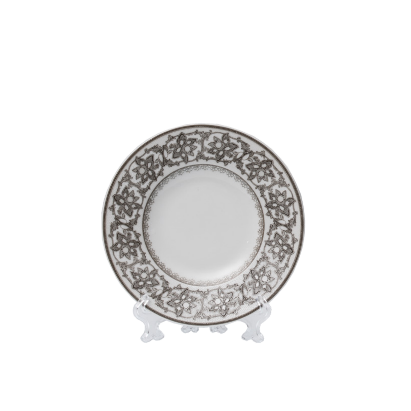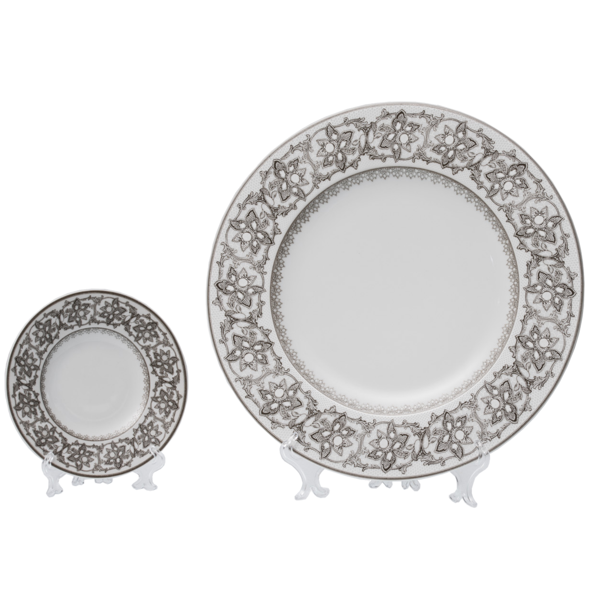 Underplate and bread saucer with silver decoration on the edge. The finess of lace in a modern version that goes well with a refined and romantic table setting.