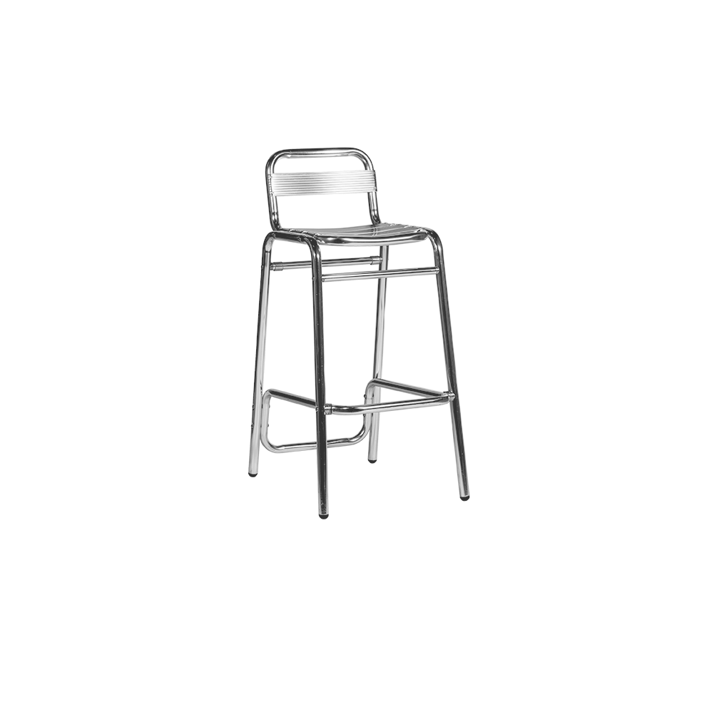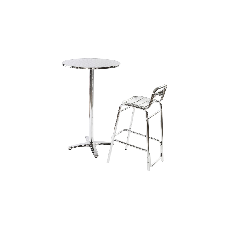 Round standing eating table with aluminum frame and top.