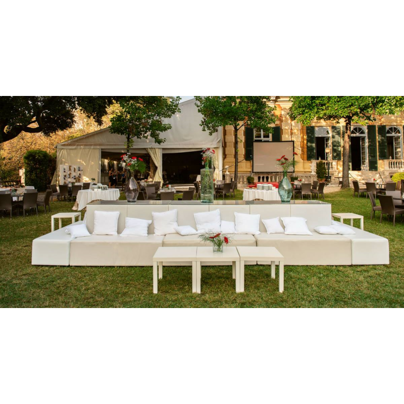 Isola luminosa composta da sedute in ecopelle bianca, cubi luminosi e cuscini coordinati. Su richiesta è possibile noleggiare cuscini anche di altri colori. La configurazione è modulabile e consente di creare composizione louge da 18,22,26 o 34 sedute.