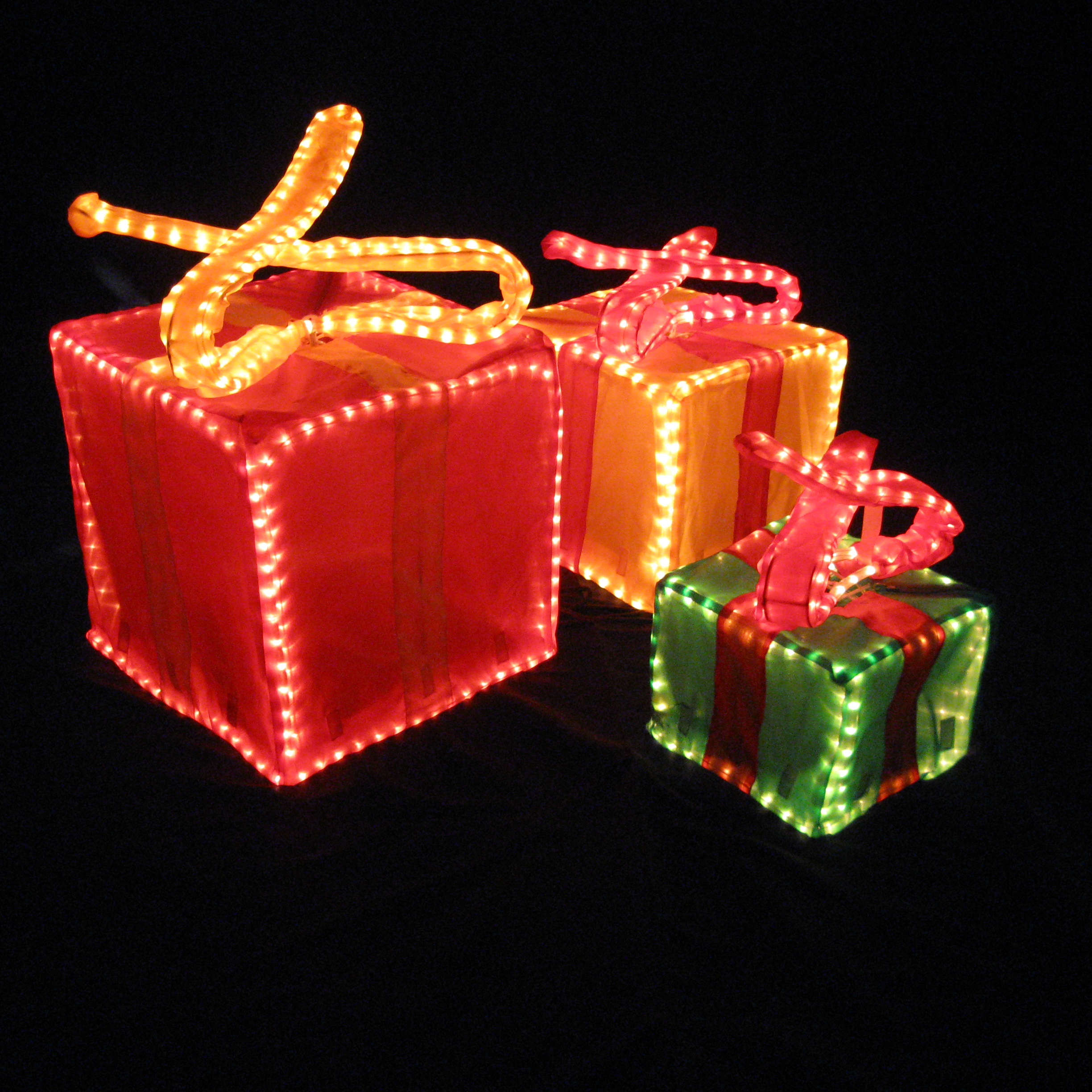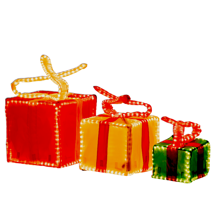 Tris di pacchi regalo ad uso decorativo con struttura in ferro e ricoperti da tessuto traslucido.